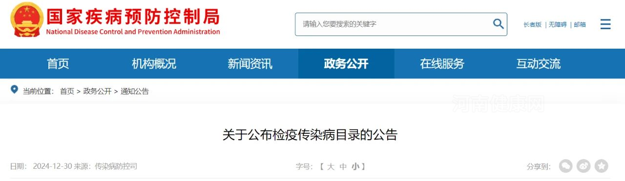 根据2024年6月28日修订的《中华人民共和国国境卫生检疫法》相关规定,公布监测传染病目录,自2025年1月1日起施行。